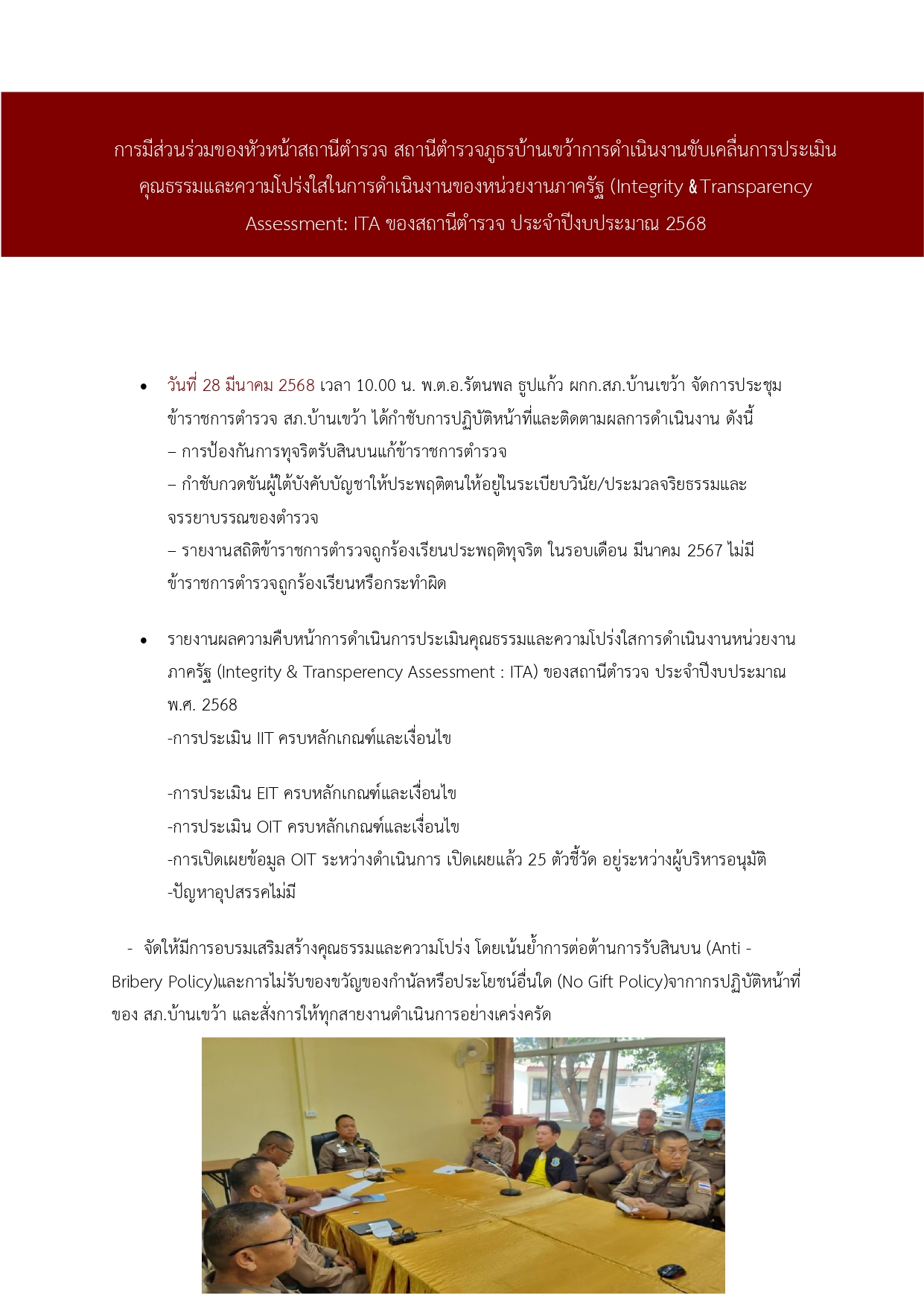 วันที่ 30 ตุลาคม 2567 เวลา 10.30 น. พ.ต.อ.รัตนพล ธูปแก้ว ผกก.สภ.บ้านเขว้า จัดการประชุมบริหาร สภ. ประจำเดือน ตุลาคม 2567 ได้เรื่องกำชับการปฏิบัติหน้าที่และติดตามผลการดำเนินงานการประเมินคุณธรรมและความโปร่งใสการดำเนินงานหน่วยงานภาครัฐ(Integrity & Transperency Assessment : ITA) ของสถานีตำรวจ ประจำปีงบประมาณ พ.ศ. 2568