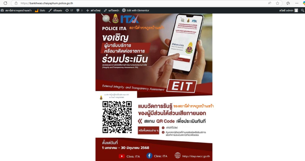ขอเชิญผู้มารับบริการหรือมาติดต่อราชการ ร่วมประเมิน คุณธรรมและความโปร่งใสในการดำเนินงานของหน่วยงานภาครัฐ ITA สภ.บ้านเขว้า ตั้งแต่ 1ม.ค.68 ถึง 30 มิ.ย.68 30 เมษายน 2568 ท่านสามารถ ร่วมประเมิน คุณธรรมและความโปร่งใสในการดำเนินงานของหน่วยงานภาครัฐ ITA สภ.บ้านเขว้า ตั้งแต่ Read more